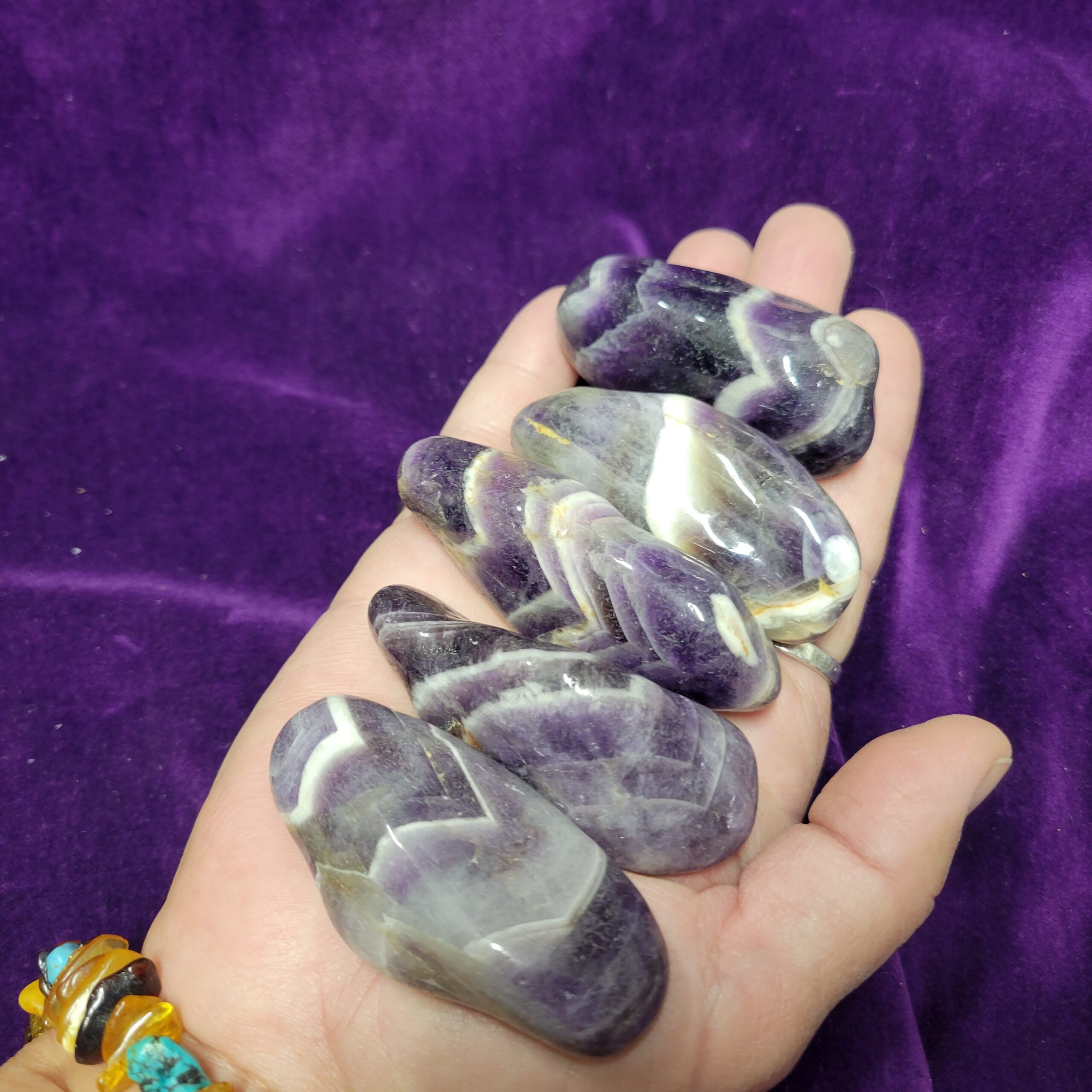 Large tumbled Chevron Amethyst stones that are roughly 2.5″ in size.