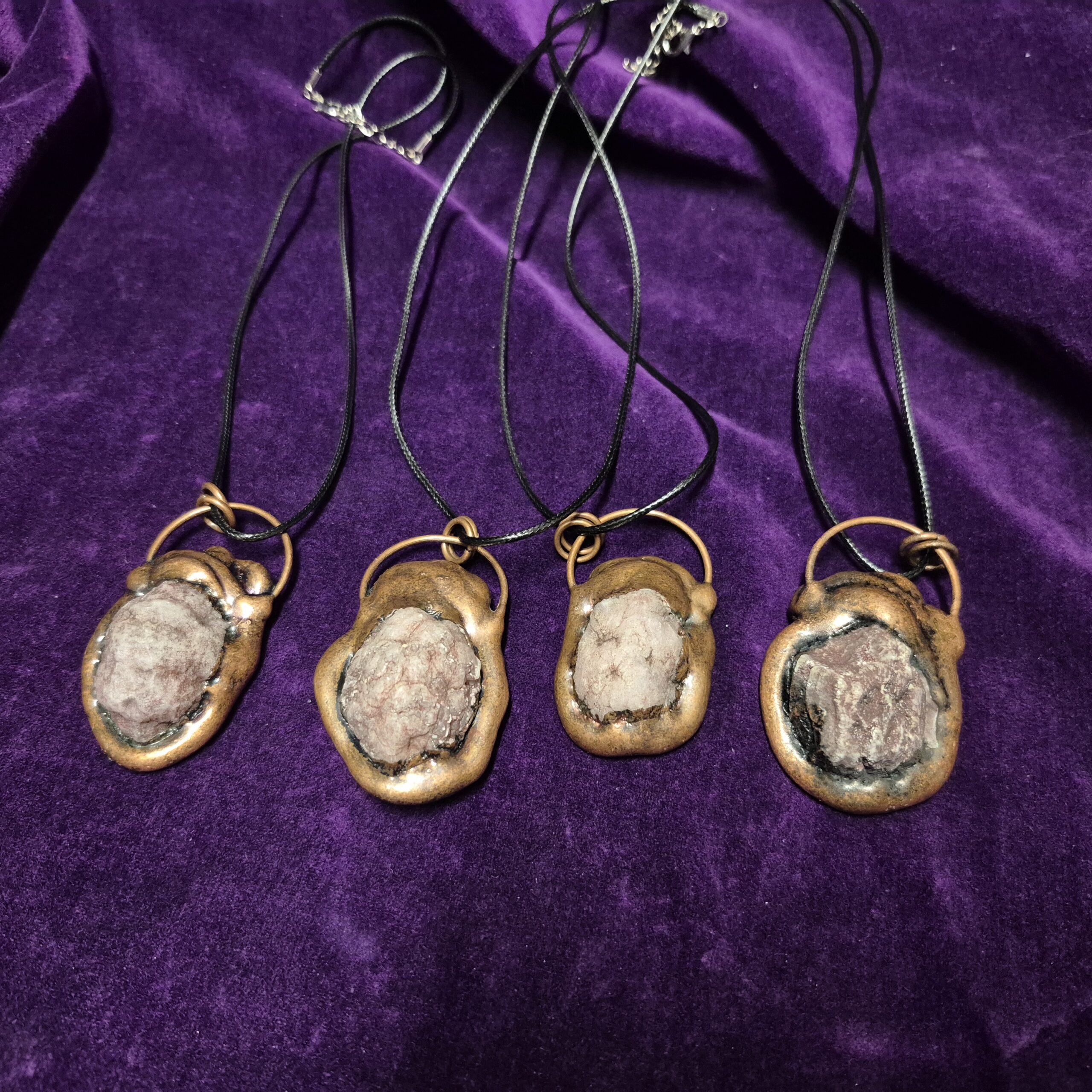 Quartz clusters with a ring of copper fused to the rock. Including the hoop at the top, each pendant is around 2 inches in size.