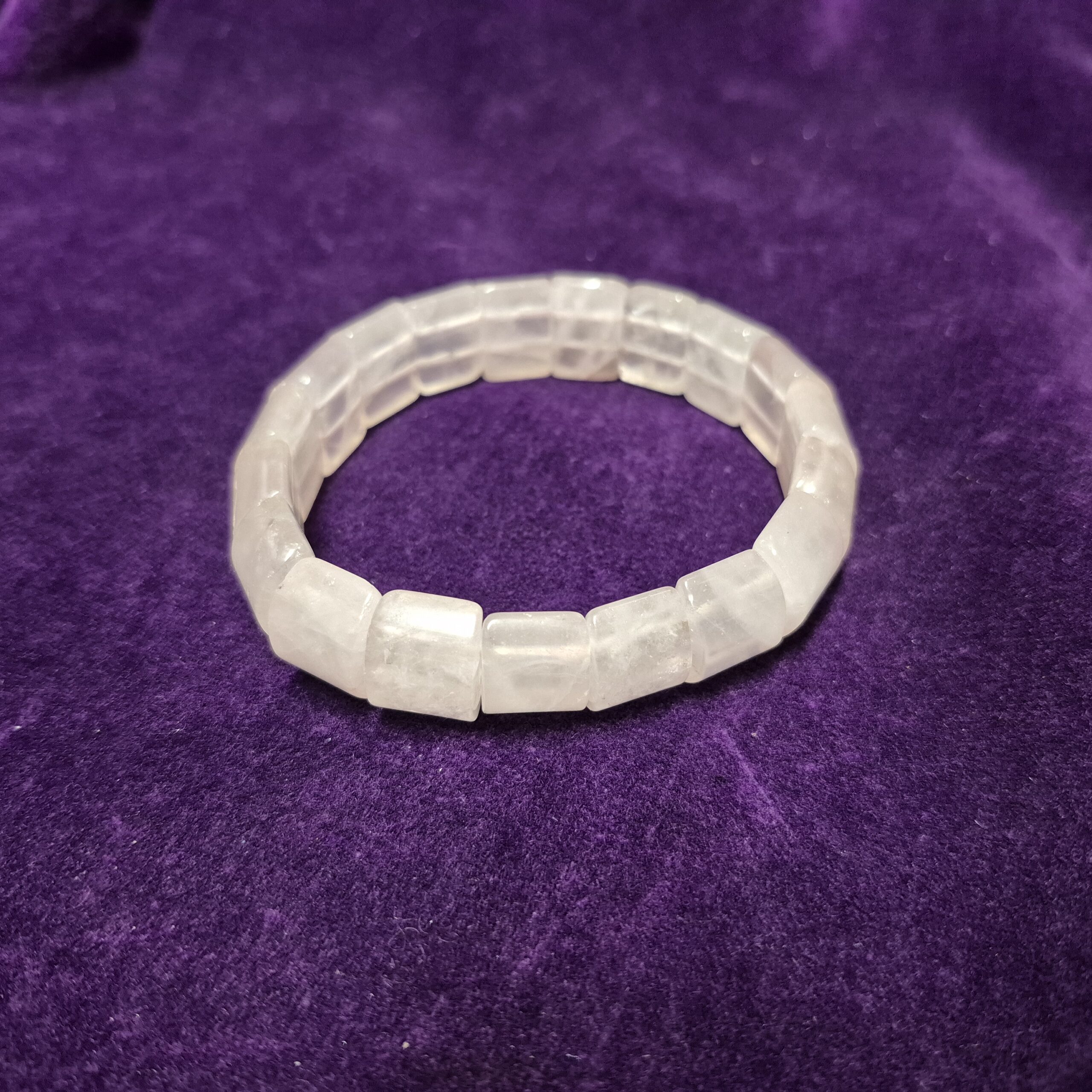 Rose Quartz bracelet with rectangular-shaped beads that are rounded on one side and flat on the other.